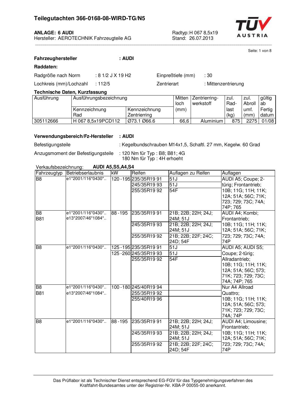 Felgengutachten / teilegutachten für Alufelgen ATS H 067 8 (8.5Jx19 ET 0, Mittenloch 0 mm) (Zertifikatsnummer au). Hier kostenlos als PDF herunterladen. Der Download-Link ist 24 Stunden gültig und kann bis zu zwei Mal verwendet werden.