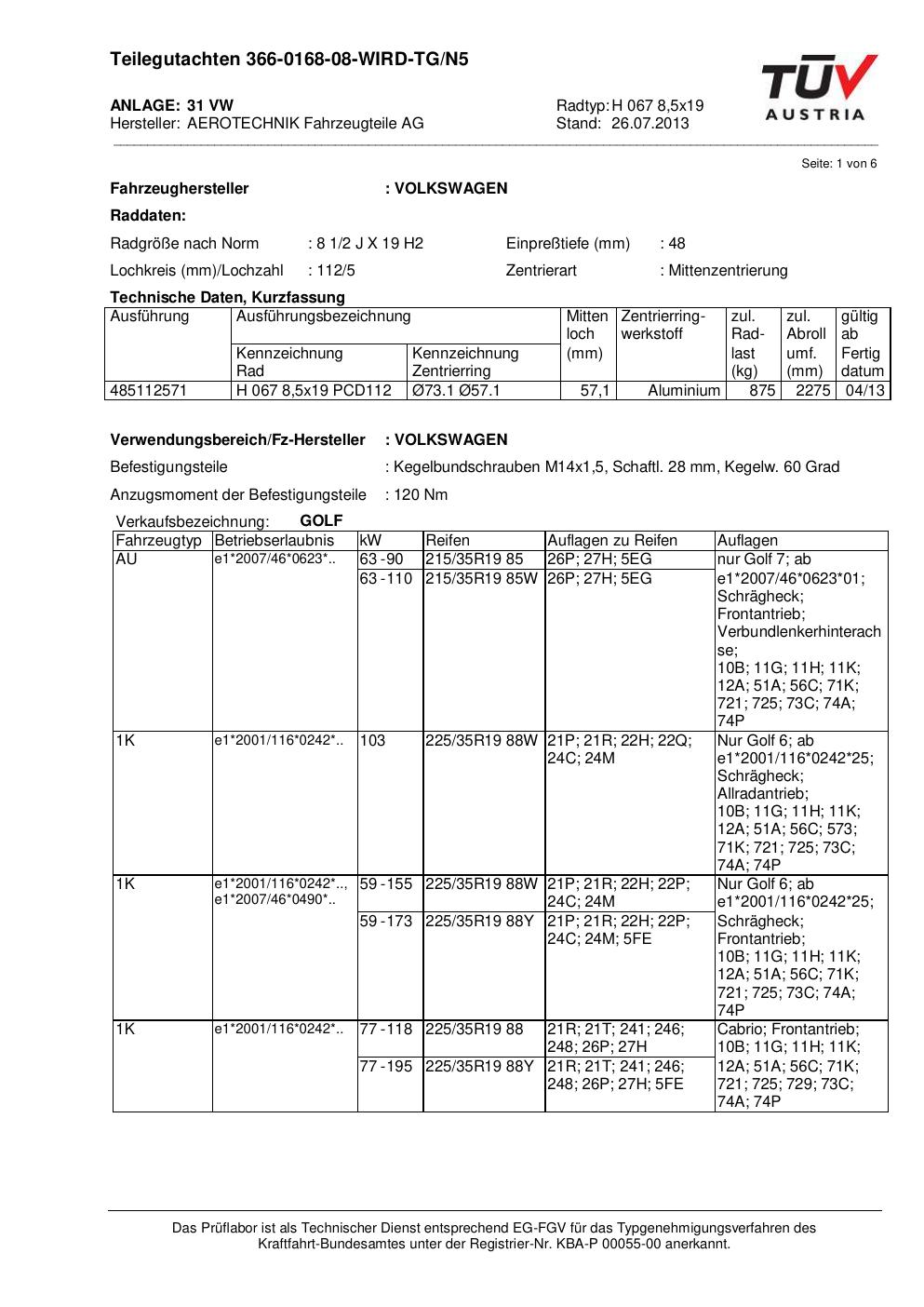 Dieses Gutachten (teilegutachten) bezieht sich auf die Alufelge ATS H 067 8 in der Ausführung 8.5Jx19 ET 0, Mittenloch 0 mm . Im PDF findest du typischerweise zulässige Reifengrößen, Auflagen/Anbauhinweise und – je nach Dokument – Hinweise zur Eintragung.