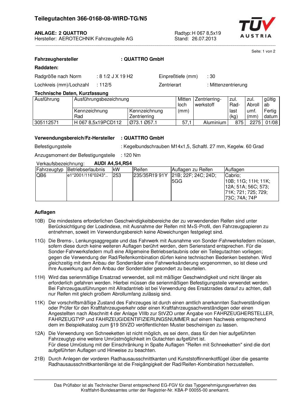 Felgengutachten / teilegutachten für Alufelgen ATS H 067 8 (8.5Jx19 ET 0, Mittenloch 0 mm) (Zertifikatsnummer au). Hier kostenlos als PDF herunterladen. Der Download-Link ist 24 Stunden gültig und kann bis zu zwei Mal verwendet werden.