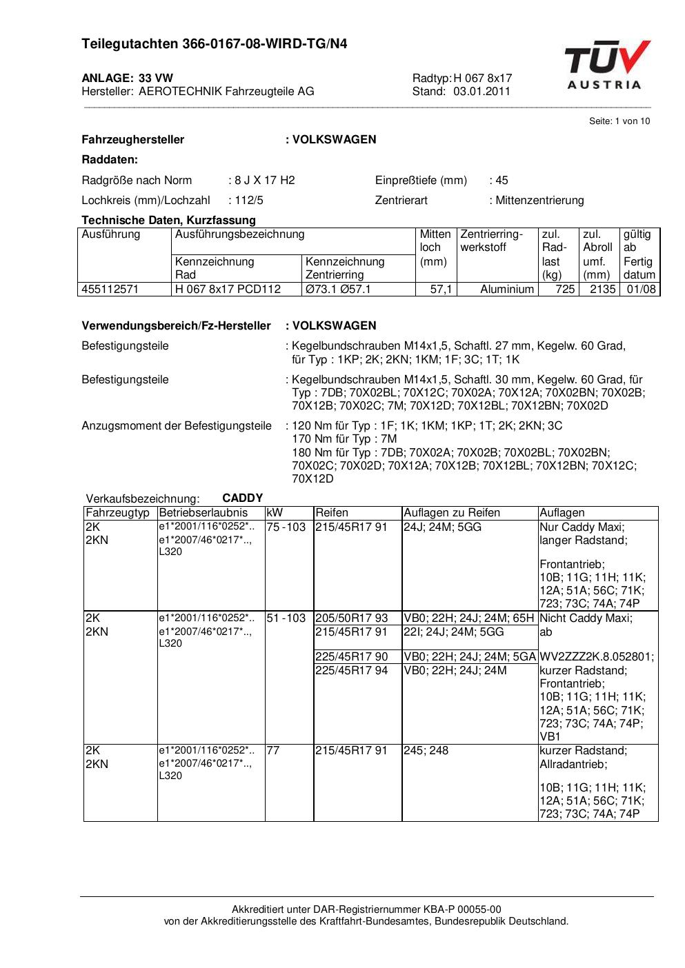 teilegutachten au ATS H 067 8x17