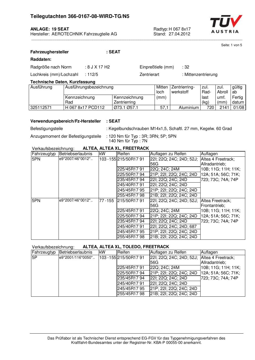 teilegutachten au ATS H 067 8x17