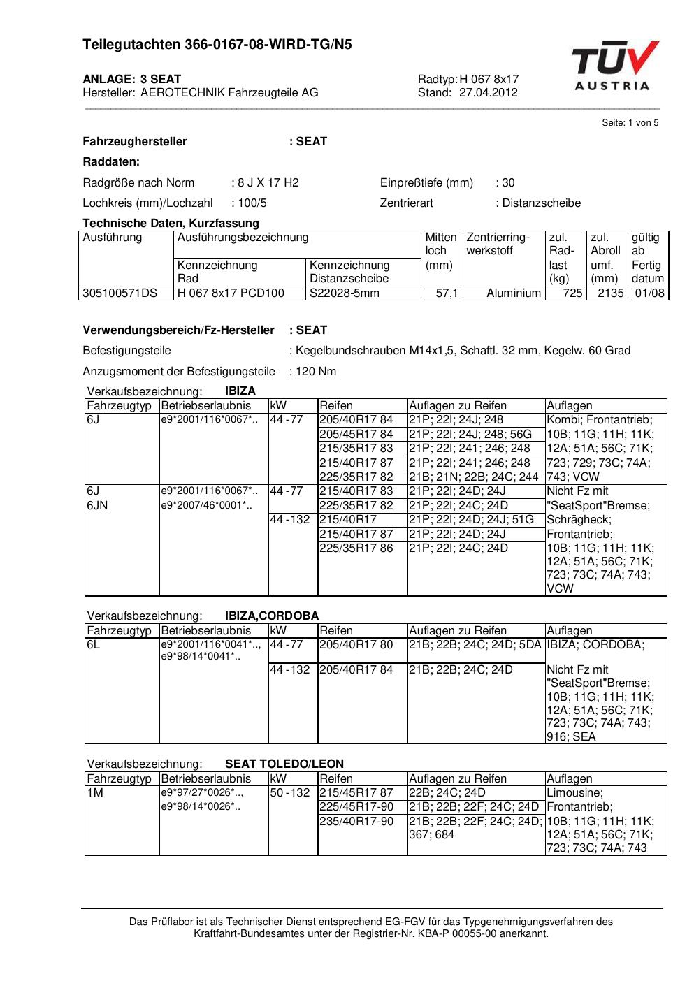 teilegutachten au ATS H 067 8x17