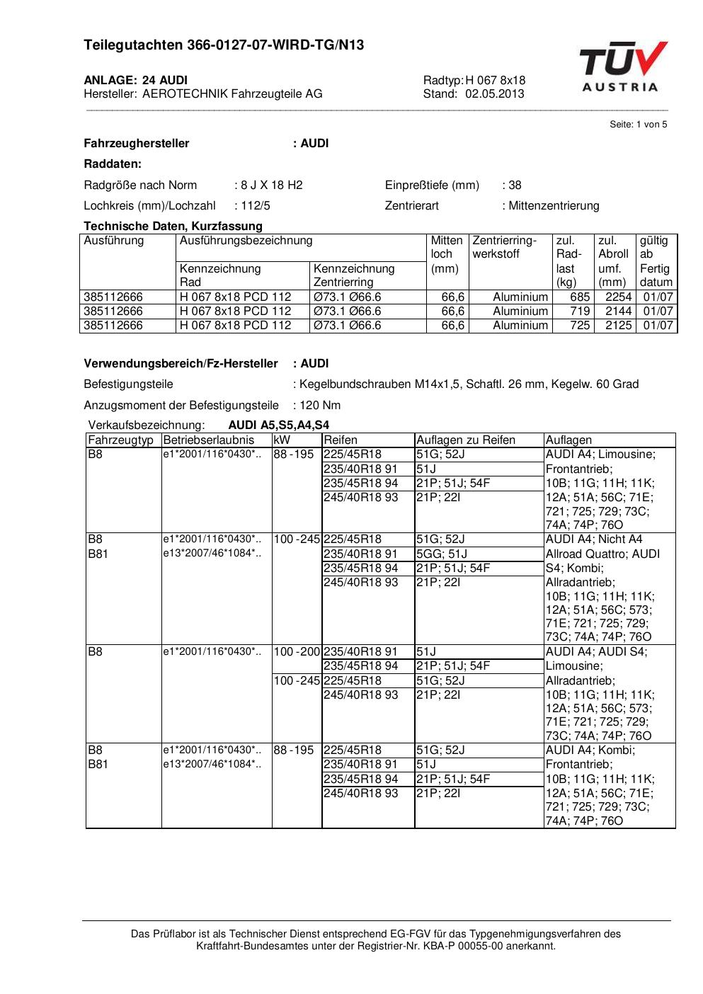 Dieses Gutachten (teilegutachten) bezieht sich auf die Alufelge ATS H 067 8x18 in der Ausführung 8Jx18 ET 0, Mittenloch 0 mm . Im PDF findest du typischerweise zulässige Reifengrößen, Auflagen/Anbauhinweise und – je nach Dokument – Hinweise zur Eintragung.