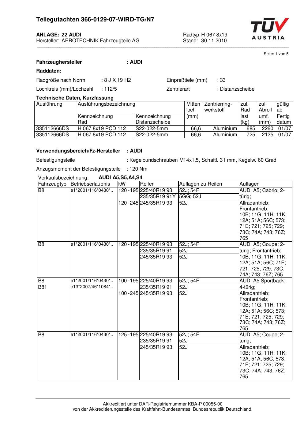 Dieses Gutachten (teilegutachten) bezieht sich auf die Alufelge ATS H 067 8x19 in der Ausführung 8Jx19 ET 0, Mittenloch 0 mm . Im PDF findest du typischerweise zulässige Reifengrößen, Auflagen/Anbauhinweise und – je nach Dokument – Hinweise zur Eintragung.