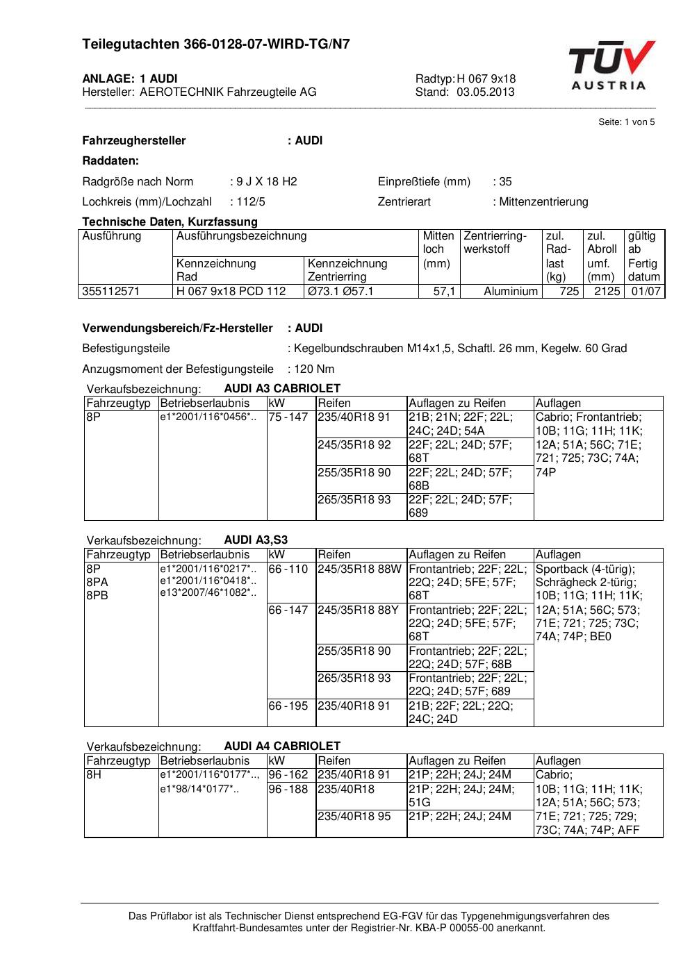 Dieses Gutachten (teilegutachten) bezieht sich auf die Alufelge ATS H 067 9x18 in der Ausführung 9Jx18 ET 0, Mittenloch 0 mm . Im PDF findest du typischerweise zulässige Reifengrößen, Auflagen/Anbauhinweise und – je nach Dokument – Hinweise zur Eintragung.