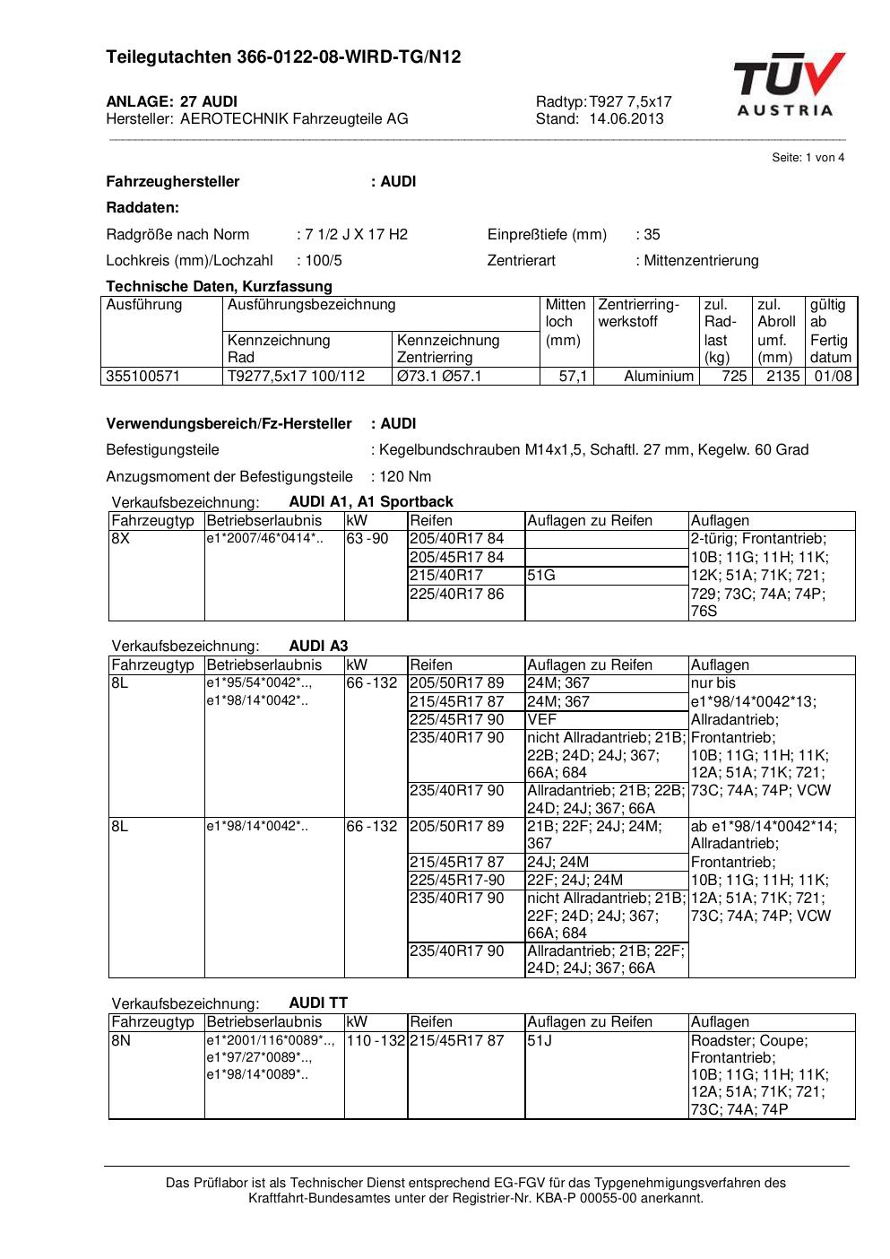 Dieses Gutachten (teilegutachten) bezieht sich auf die Alufelge ATS T927 7 in der Ausführung 7.5Jx17 ET 0, Mittenloch 0 mm . Im PDF findest du typischerweise zulässige Reifengrößen, Auflagen/Anbauhinweise und – je nach Dokument – Hinweise zur Eintragung.