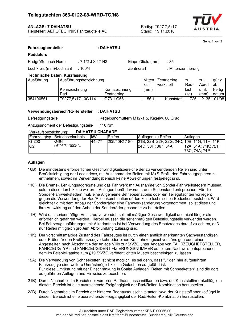 Dieses Gutachten (teilegutachten) bezieht sich auf die Alufelge ATS T927 7 in der Ausführung 7.5Jx17 ET 0, Mittenloch 0 mm . Im PDF findest du typischerweise zulässige Reifengrößen, Auflagen/Anbauhinweise und – je nach Dokument – Hinweise zur Eintragung.