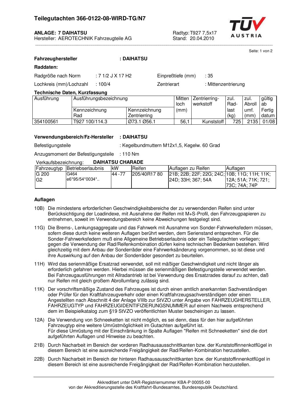 Dieses Gutachten (teilegutachten) bezieht sich auf die Alufelge ATS T927 7 in der Ausführung 7.5Jx17 ET 0, Mittenloch 0 mm . Im PDF findest du typischerweise zulässige Reifengrößen, Auflagen/Anbauhinweise und – je nach Dokument – Hinweise zur Eintragung.