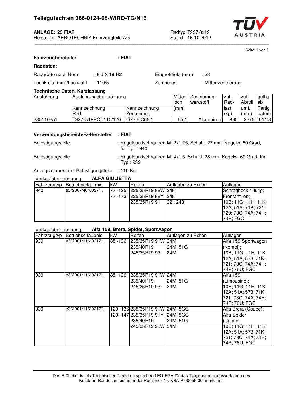 Dieses Gutachten (teilegutachten) bezieht sich auf die Alufelge ATS T927 8x19 in der Ausführung 8Jx19 ET 0, Mittenloch 0 mm . Im PDF findest du typischerweise zulässige Reifengrößen, Auflagen/Anbauhinweise und – je nach Dokument – Hinweise zur Eintragung.