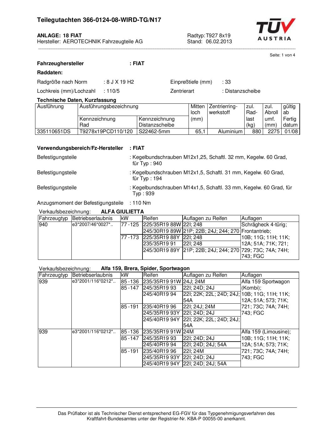 Dieses Gutachten (teilegutachten) bezieht sich auf die Alufelge ATS T927 8x19 in der Ausführung 8Jx19 ET 0, Mittenloch 0 mm . Im PDF findest du typischerweise zulässige Reifengrößen, Auflagen/Anbauhinweise und – je nach Dokument – Hinweise zur Eintragung.