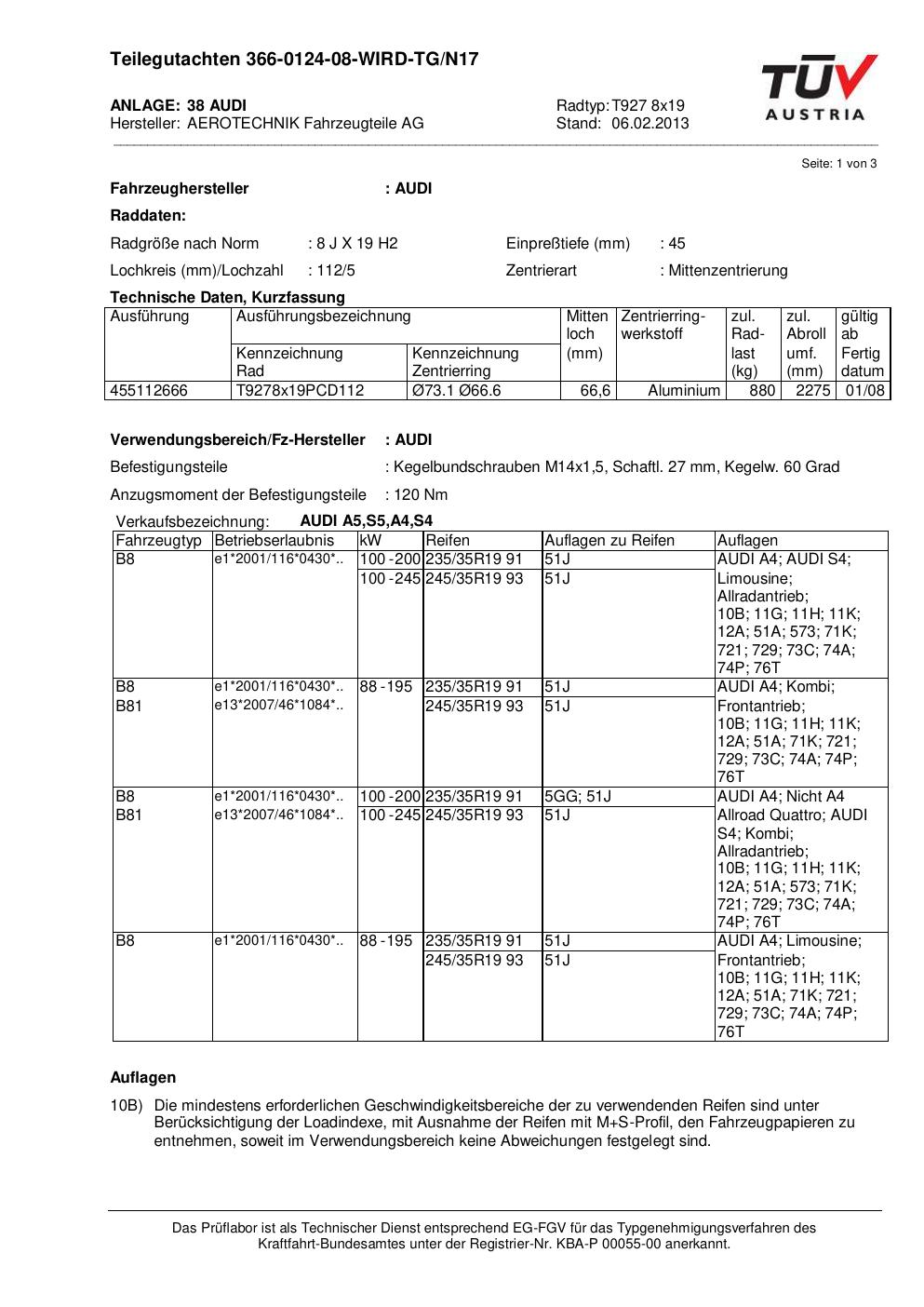 Dieses Gutachten (teilegutachten) bezieht sich auf die Alufelge ATS T927 8x19 in der Ausführung 8Jx19 ET 0, Mittenloch 0 mm . Im PDF findest du typischerweise zulässige Reifengrößen, Auflagen/Anbauhinweise und – je nach Dokument – Hinweise zur Eintragung.