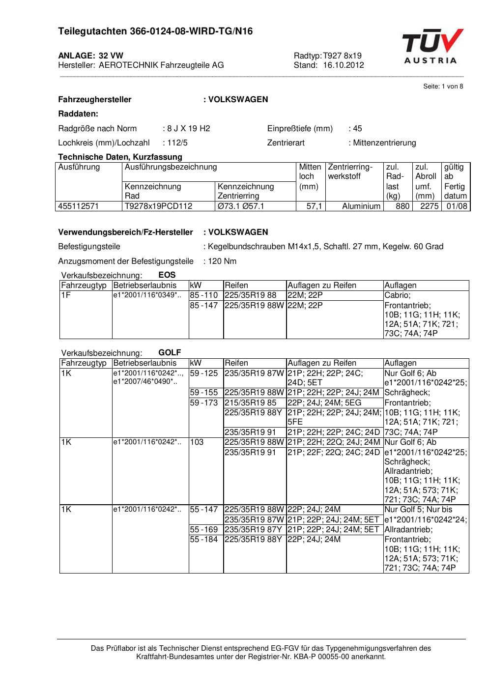 Dieses Gutachten (teilegutachten) bezieht sich auf die Alufelge ATS T927 8x19 in der Ausführung 8Jx19 ET 0, Mittenloch 0 mm . Im PDF findest du typischerweise zulässige Reifengrößen, Auflagen/Anbauhinweise und – je nach Dokument – Hinweise zur Eintragung.