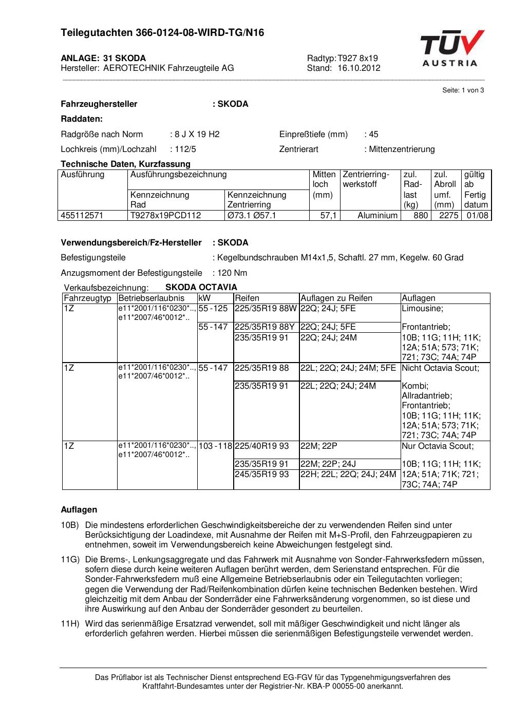 Dieses Gutachten (teilegutachten) bezieht sich auf die Alufelge ATS T927 8x19 in der Ausführung 8Jx19 ET 0, Mittenloch 0 mm . Im PDF findest du typischerweise zulässige Reifengrößen, Auflagen/Anbauhinweise und – je nach Dokument – Hinweise zur Eintragung.