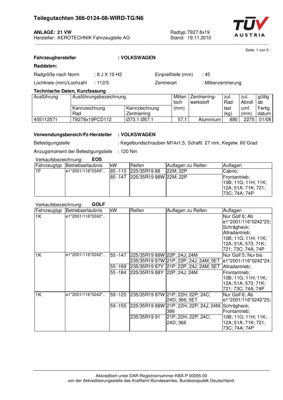 Dieses Gutachten (teilegutachten) bezieht sich auf die Alufelge ATS T927 8x19 in der Ausführung 8Jx19 ET 0, Mittenloch 0 mm . Im PDF findest du typischerweise zulässige Reifengrößen, Auflagen/Anbauhinweise und – je nach Dokument – Hinweise zur Eintragung.
