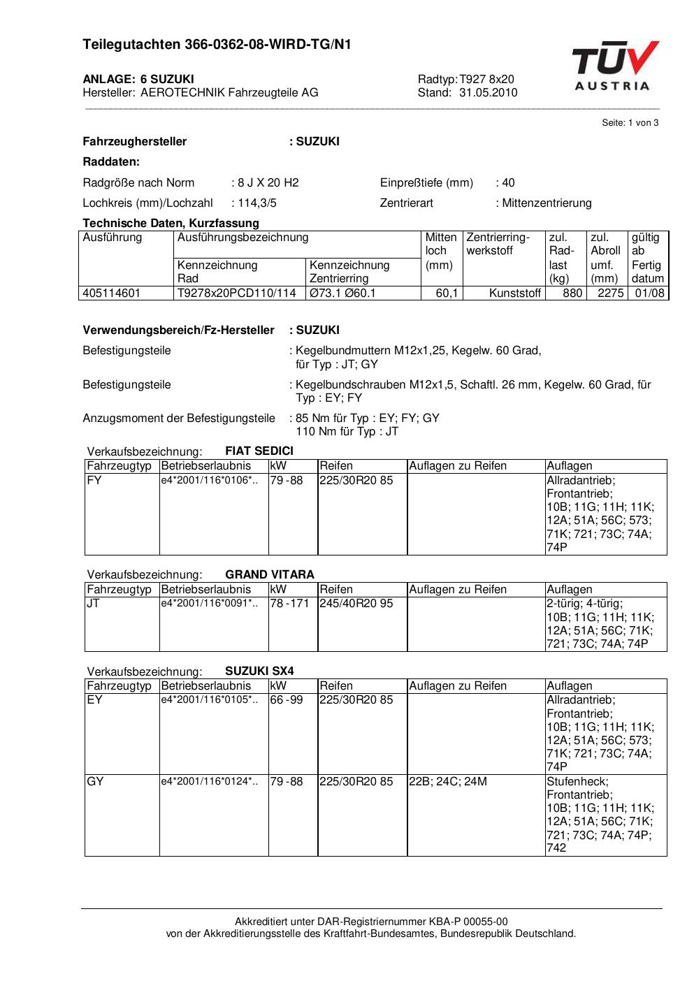 Dieses Gutachten (teilegutachten) bezieht sich auf die Alufelge ATS T927 8x20 in der Ausführung 8Jx2 ET 0, Mittenloch 0 mm . Im PDF findest du typischerweise zulässige Reifengrößen, Auflagen/Anbauhinweise und – je nach Dokument – Hinweise zur Eintragung.