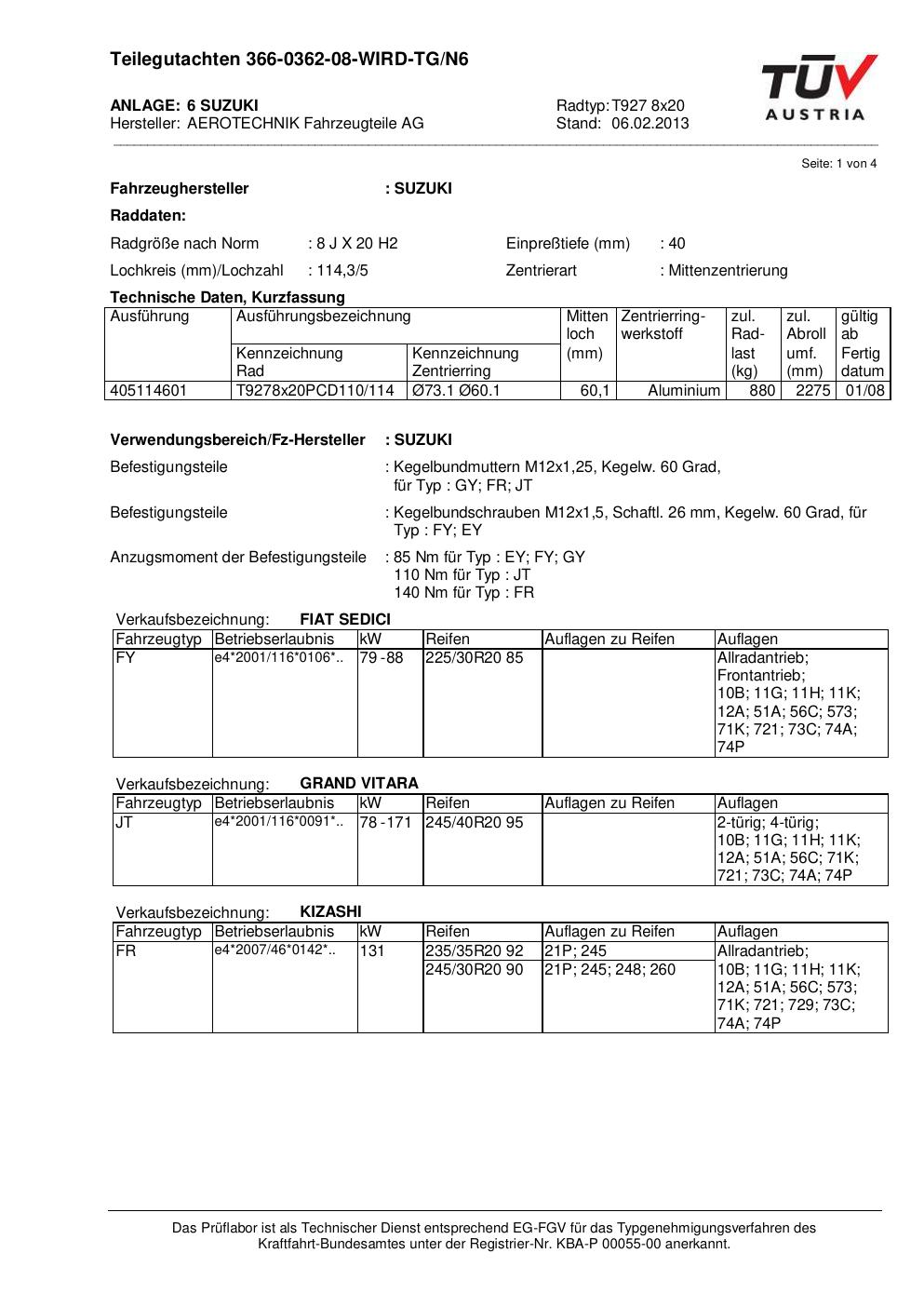 Dieses Gutachten (teilegutachten) bezieht sich auf die Alufelge ATS T927 8x20 in der Ausführung 8Jx2 ET 0, Mittenloch 0 mm . Im PDF findest du typischerweise zulässige Reifengrößen, Auflagen/Anbauhinweise und – je nach Dokument – Hinweise zur Eintragung.