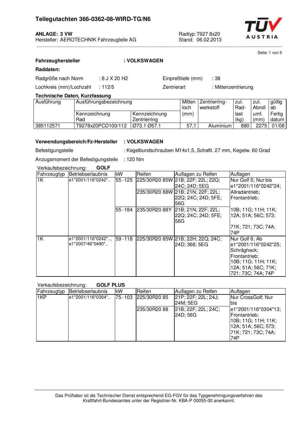Dieses Gutachten (teilegutachten) bezieht sich auf die Alufelge ATS T927 8x20 in der Ausführung 8Jx2 ET 0, Mittenloch 0 mm . Im PDF findest du typischerweise zulässige Reifengrößen, Auflagen/Anbauhinweise und – je nach Dokument – Hinweise zur Eintragung.
