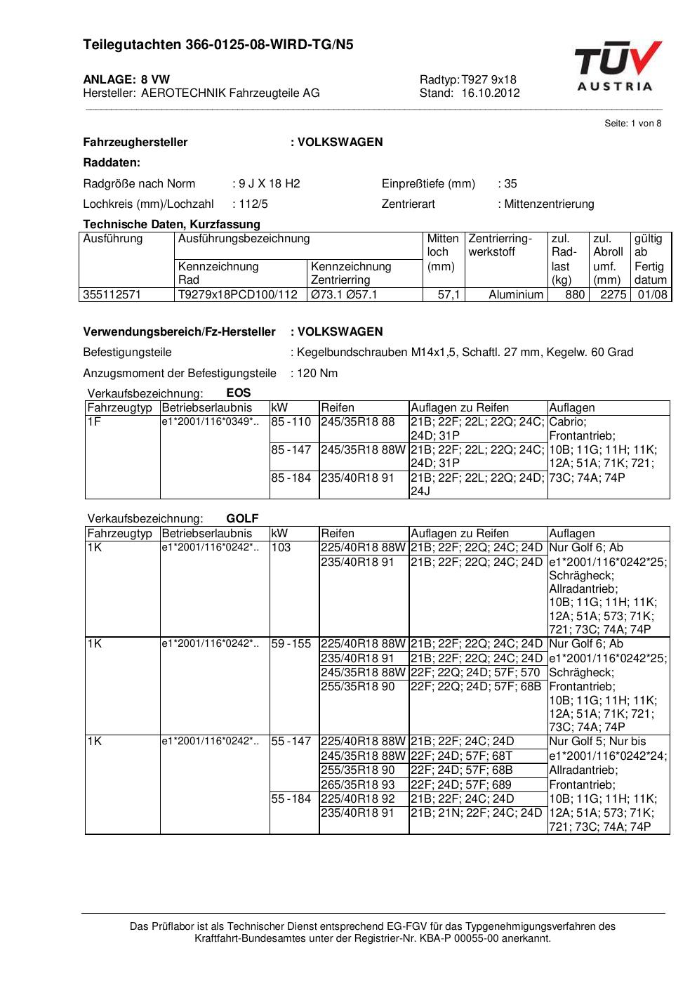 Dieses Gutachten (teilegutachten) bezieht sich auf die Alufelge ATS T927 9x18 in der Ausführung 9Jx18 ET 0, Mittenloch 0 mm . Im PDF findest du typischerweise zulässige Reifengrößen, Auflagen/Anbauhinweise und – je nach Dokument – Hinweise zur Eintragung.