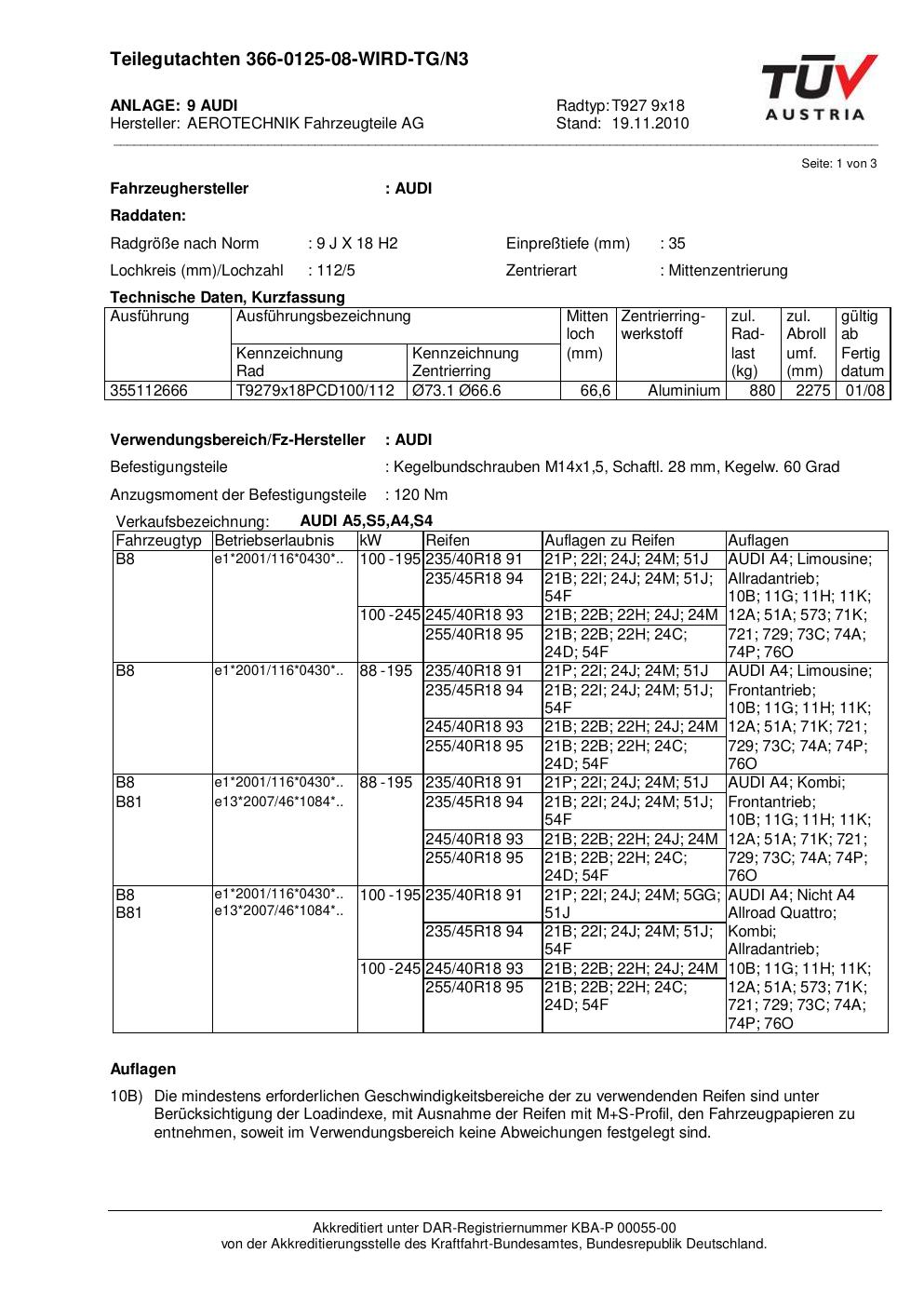 Dieses Gutachten (teilegutachten) bezieht sich auf die Alufelge ATS T927 9x18 in der Ausführung 9Jx18 ET 0, Mittenloch 0 mm . Im PDF findest du typischerweise zulässige Reifengrößen, Auflagen/Anbauhinweise und – je nach Dokument – Hinweise zur Eintragung.
