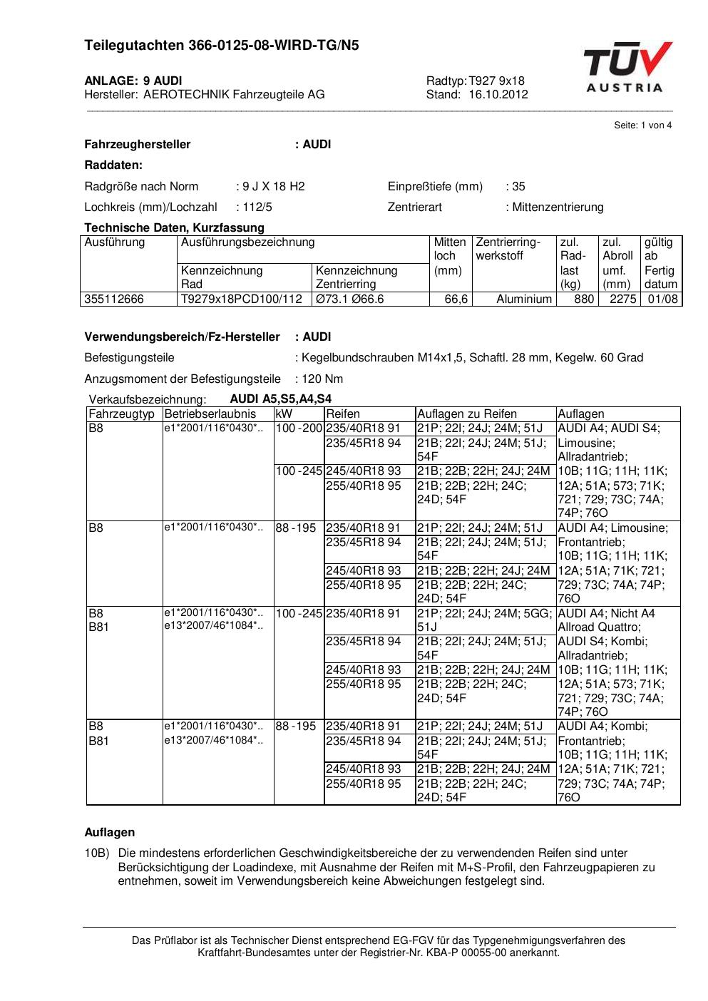 Dieses Gutachten (teilegutachten) bezieht sich auf die Alufelge ATS T927 9x18 in der Ausführung 9Jx18 ET 0, Mittenloch 0 mm . Im PDF findest du typischerweise zulässige Reifengrößen, Auflagen/Anbauhinweise und – je nach Dokument – Hinweise zur Eintragung.