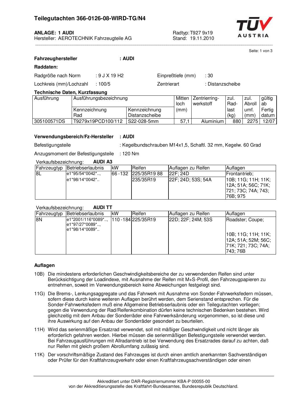 Dieses Gutachten (teilegutachten) bezieht sich auf die Alufelge ATS T927 9x19 in der Ausführung 9Jx19 ET 0, Mittenloch 0 mm . Im PDF findest du typischerweise zulässige Reifengrößen, Auflagen/Anbauhinweise und – je nach Dokument – Hinweise zur Eintragung.