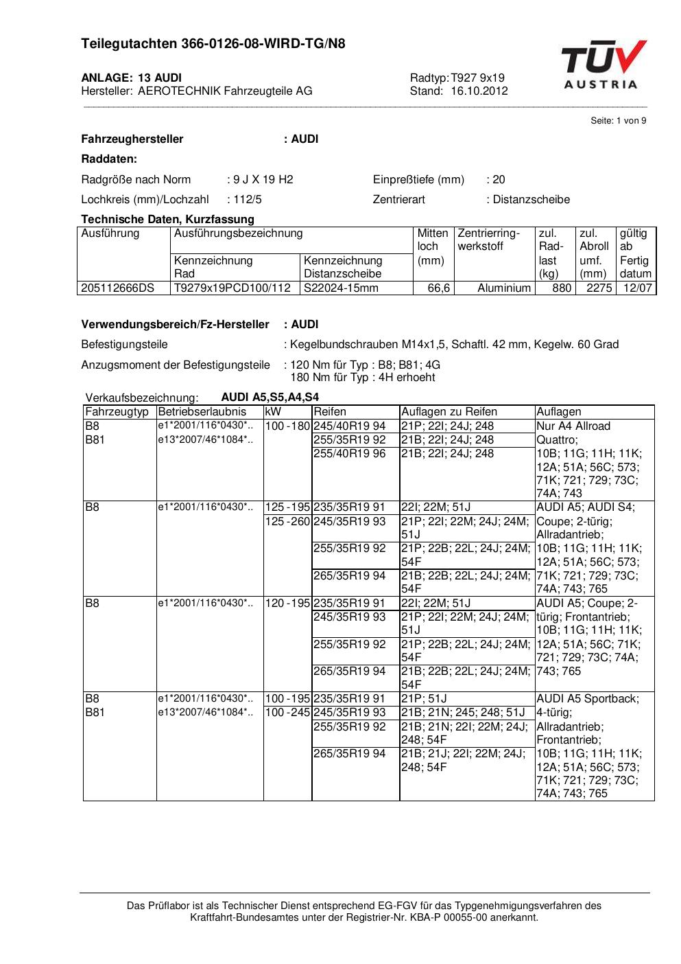 Dieses Gutachten (teilegutachten) bezieht sich auf die Alufelge ATS T927 9x19 in der Ausführung 9Jx19 ET 0, Mittenloch 0 mm . Im PDF findest du typischerweise zulässige Reifengrößen, Auflagen/Anbauhinweise und – je nach Dokument – Hinweise zur Eintragung.