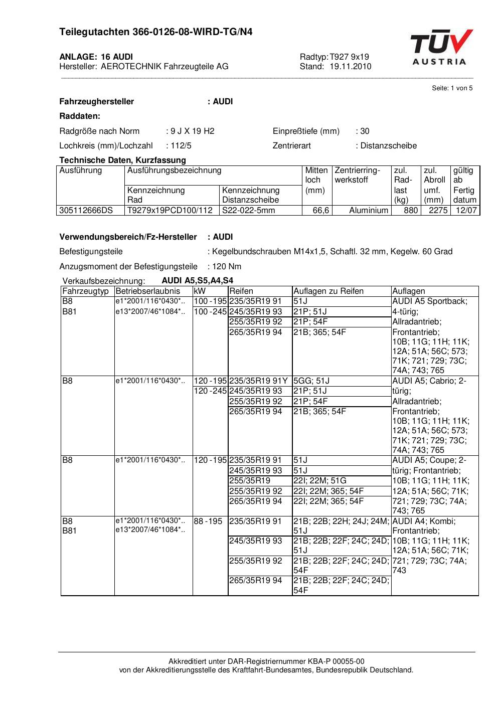 Dieses Gutachten (teilegutachten) bezieht sich auf die Alufelge ATS T927 9x19 in der Ausführung 9Jx19 ET 0, Mittenloch 0 mm . Im PDF findest du typischerweise zulässige Reifengrößen, Auflagen/Anbauhinweise und – je nach Dokument – Hinweise zur Eintragung.