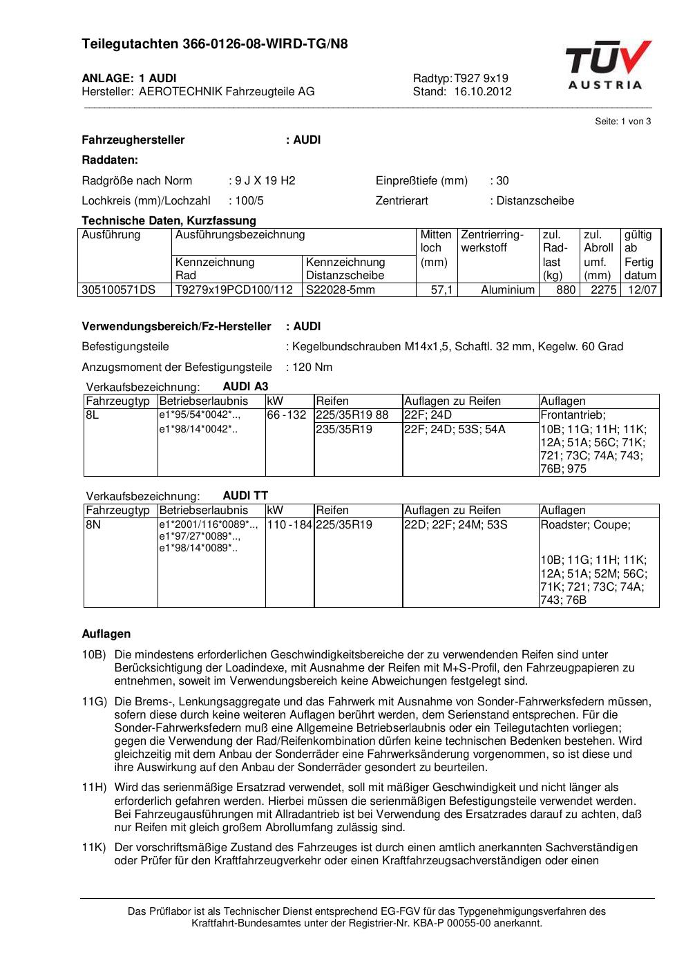 Dieses Gutachten (teilegutachten) bezieht sich auf die Alufelge ATS T927 9x19 in der Ausführung 9Jx19 ET 0, Mittenloch 0 mm . Im PDF findest du typischerweise zulässige Reifengrößen, Auflagen/Anbauhinweise und – je nach Dokument – Hinweise zur Eintragung.