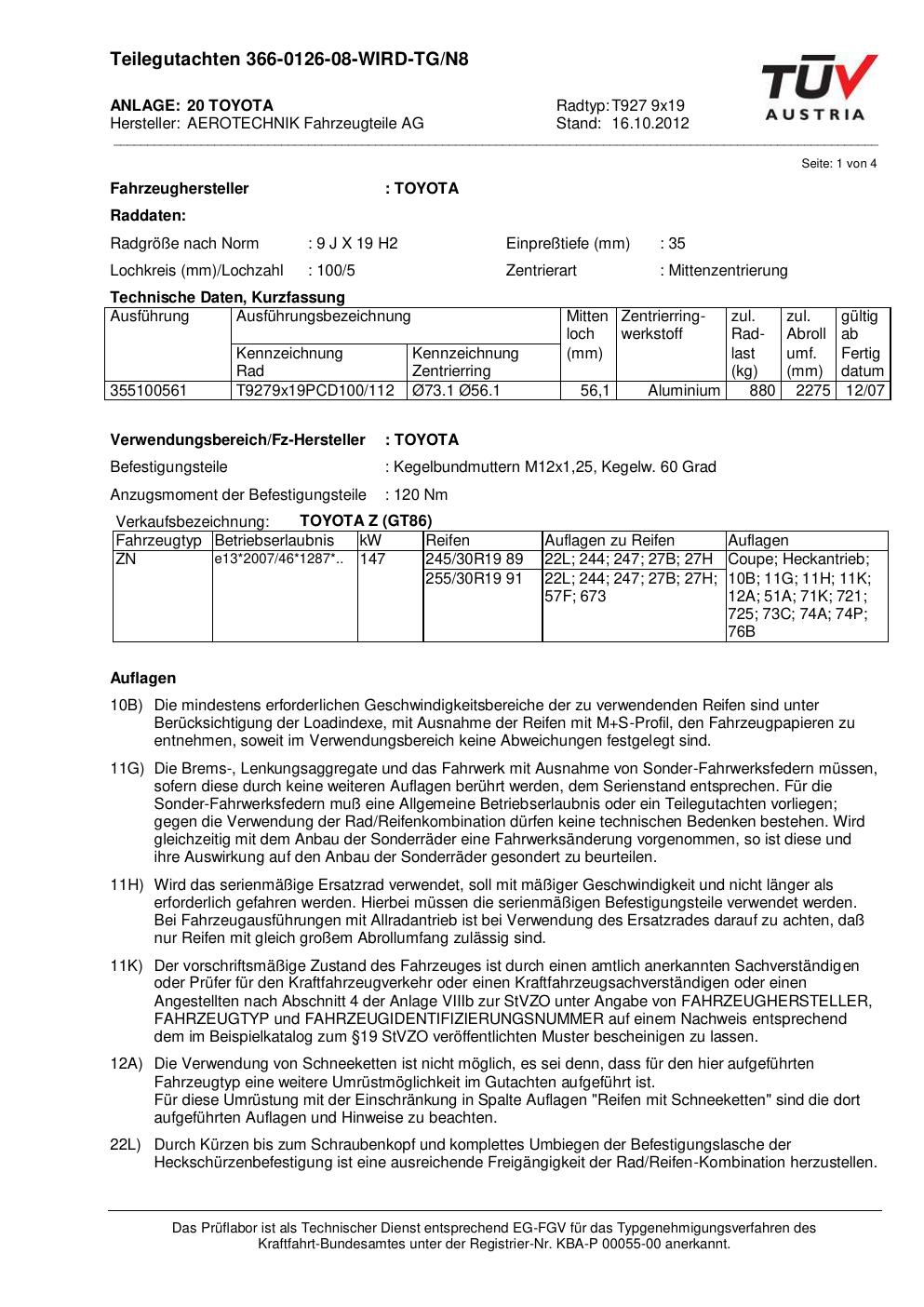 Dieses Gutachten (teilegutachten) bezieht sich auf die Alufelge ATS T927 9x19 in der Ausführung 9Jx19 ET 0, Mittenloch 0 mm . Im PDF findest du typischerweise zulässige Reifengrößen, Auflagen/Anbauhinweise und – je nach Dokument – Hinweise zur Eintragung.