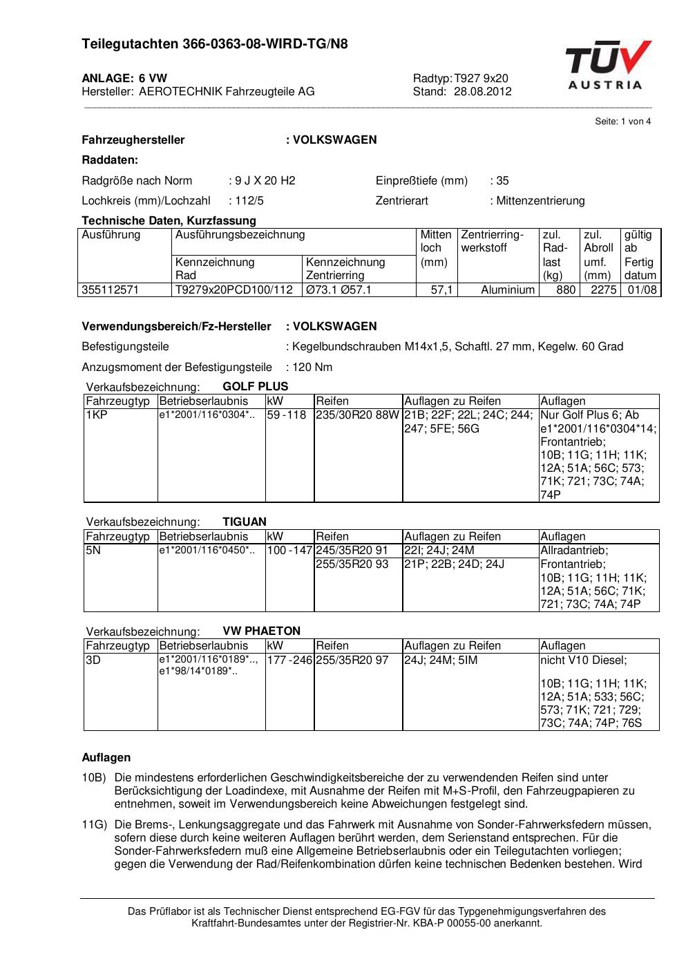 Dieses Gutachten (teilegutachten) bezieht sich auf die Alufelge ATS T927 9x20 in der Ausführung 9Jx2 ET 0, Mittenloch 0 mm . Im PDF findest du typischerweise zulässige Reifengrößen, Auflagen/Anbauhinweise und – je nach Dokument – Hinweise zur Eintragung.