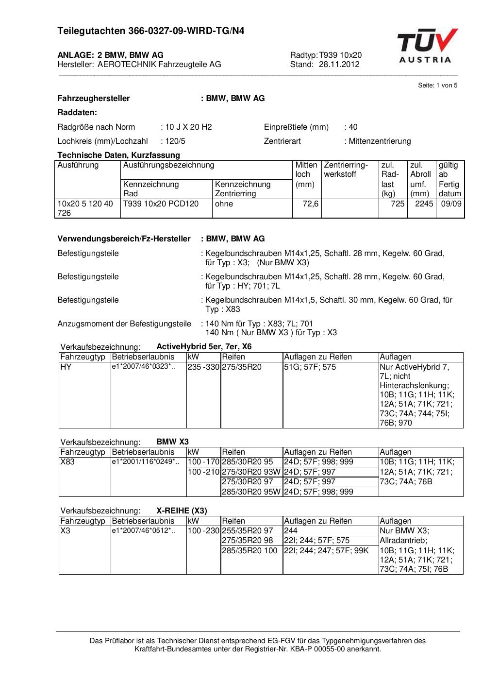 Dieses Gutachten (teilegutachten) bezieht sich auf die Alufelge ATS T939 10x20 in der Ausführung 10Jx2 ET 0, Mittenloch 0 mm . Im PDF findest du typischerweise zulässige Reifengrößen, Auflagen/Anbauhinweise und – je nach Dokument – Hinweise zur Eintragung.