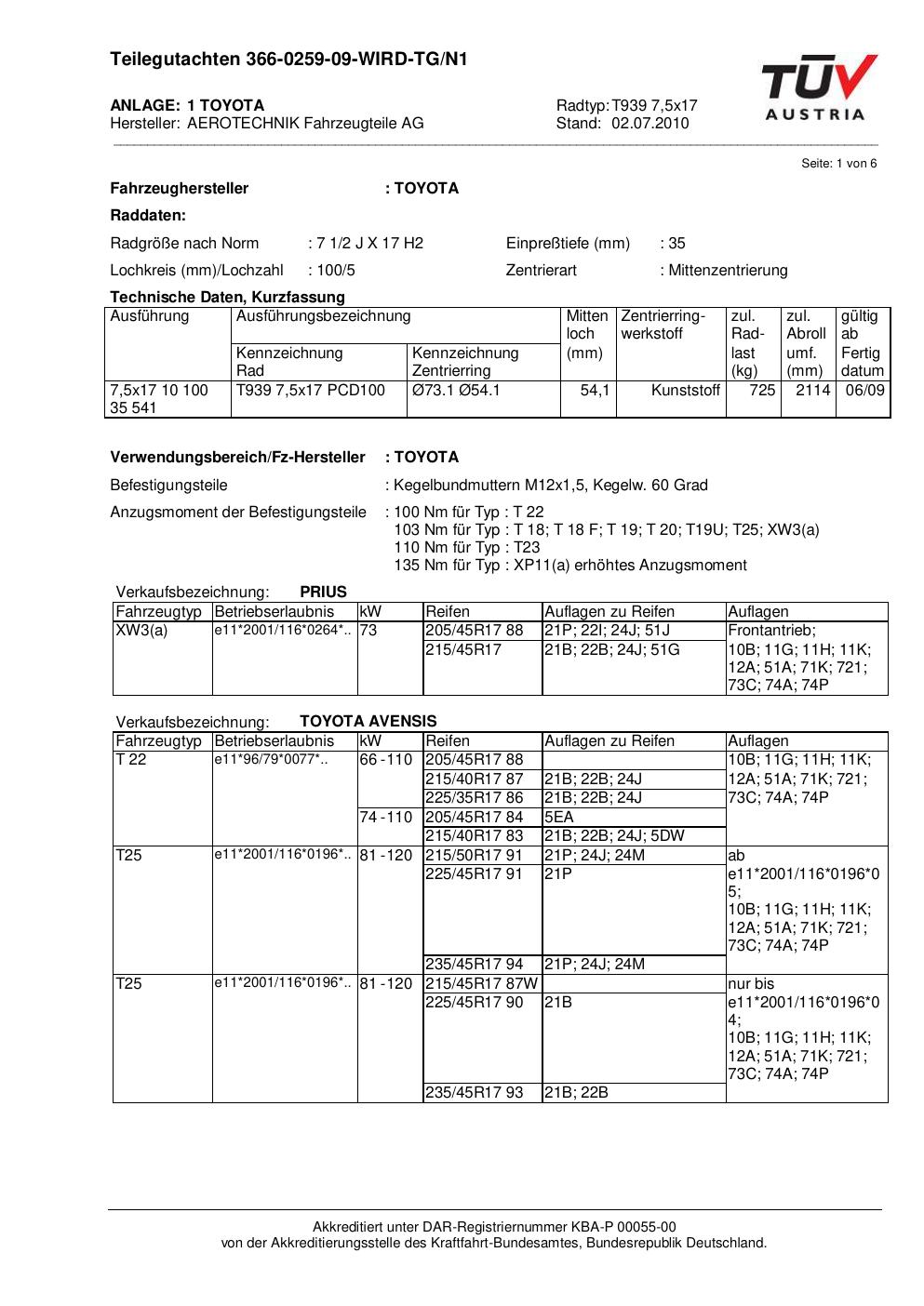 Dieses Gutachten (teilegutachten) bezieht sich auf die Alufelge ATS T939 7 in der Ausführung 7.5Jx17 ET 0, Mittenloch 0 mm . Im PDF findest du typischerweise zulässige Reifengrößen, Auflagen/Anbauhinweise und – je nach Dokument – Hinweise zur Eintragung.