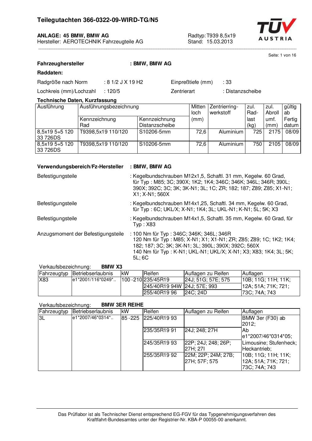 Dieses Gutachten (teilegutachten) bezieht sich auf die Alufelge ATS T939 8 in der Ausführung 8.5Jx19 ET 0, Mittenloch 0 mm . Im PDF findest du typischerweise zulässige Reifengrößen, Auflagen/Anbauhinweise und – je nach Dokument – Hinweise zur Eintragung.