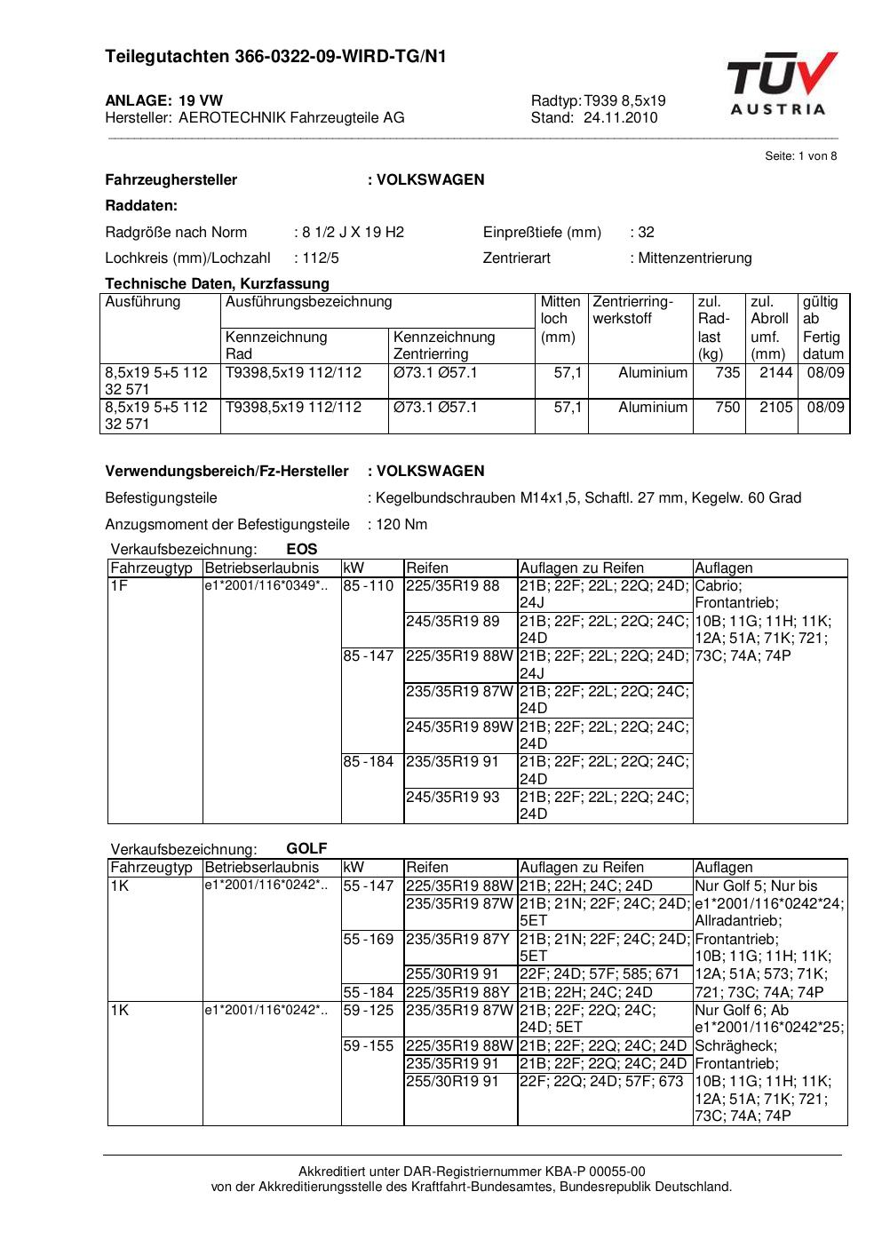 Dieses Gutachten (teilegutachten) bezieht sich auf die Alufelge ATS T939 8 in der Ausführung 8.5Jx19 ET 0, Mittenloch 0 mm . Im PDF findest du typischerweise zulässige Reifengrößen, Auflagen/Anbauhinweise und – je nach Dokument – Hinweise zur Eintragung.
