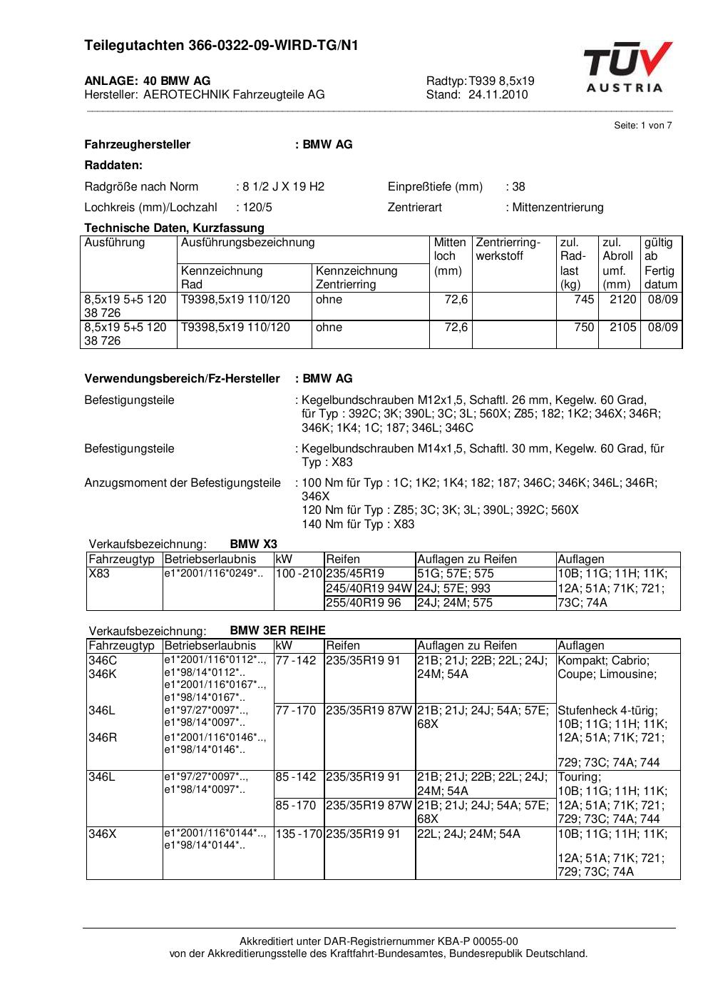 Dieses Gutachten (teilegutachten) bezieht sich auf die Alufelge ATS T939 8 in der Ausführung 8.5Jx19 ET 0, Mittenloch 0 mm . Im PDF findest du typischerweise zulässige Reifengrößen, Auflagen/Anbauhinweise und – je nach Dokument – Hinweise zur Eintragung.