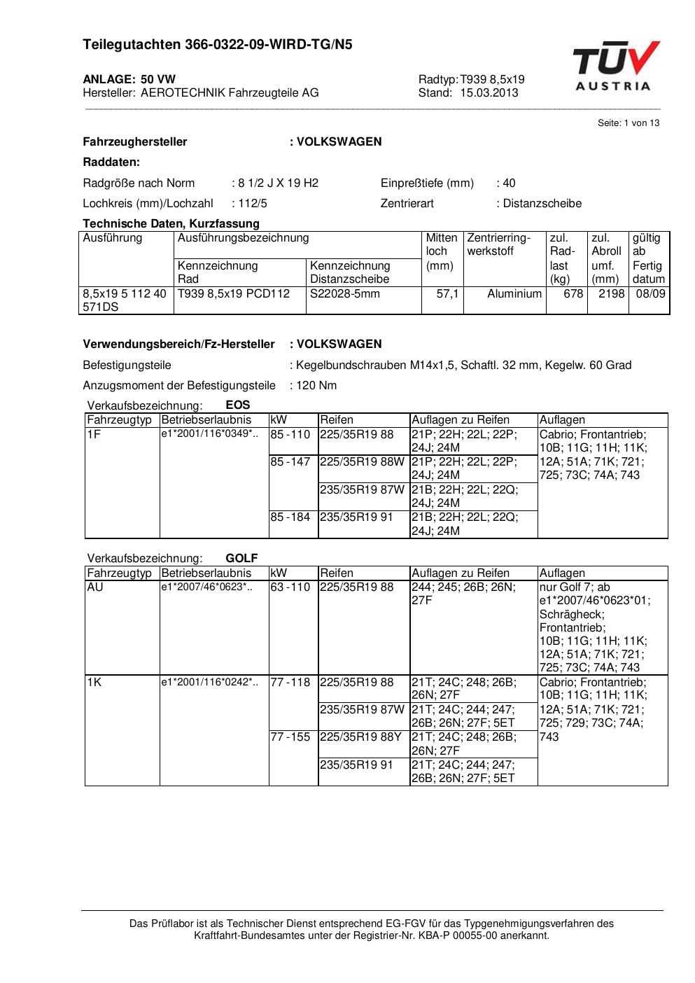 Dieses Gutachten (teilegutachten) bezieht sich auf die Alufelge ATS T939 8 in der Ausführung 8.5Jx19 ET 0, Mittenloch 0 mm . Im PDF findest du typischerweise zulässige Reifengrößen, Auflagen/Anbauhinweise und – je nach Dokument – Hinweise zur Eintragung.