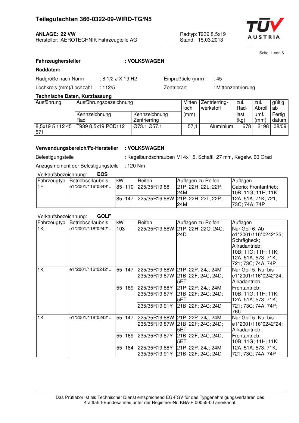 Felgengutachten / teilegutachten für Alufelgen ATS T939 8 (8.5Jx19 ET 0, Mittenloch 0 mm) (Zertifikatsnummer au). Hier kostenlos als PDF herunterladen. Der Download-Link ist 24 Stunden gültig und kann bis zu zwei Mal verwendet werden.
