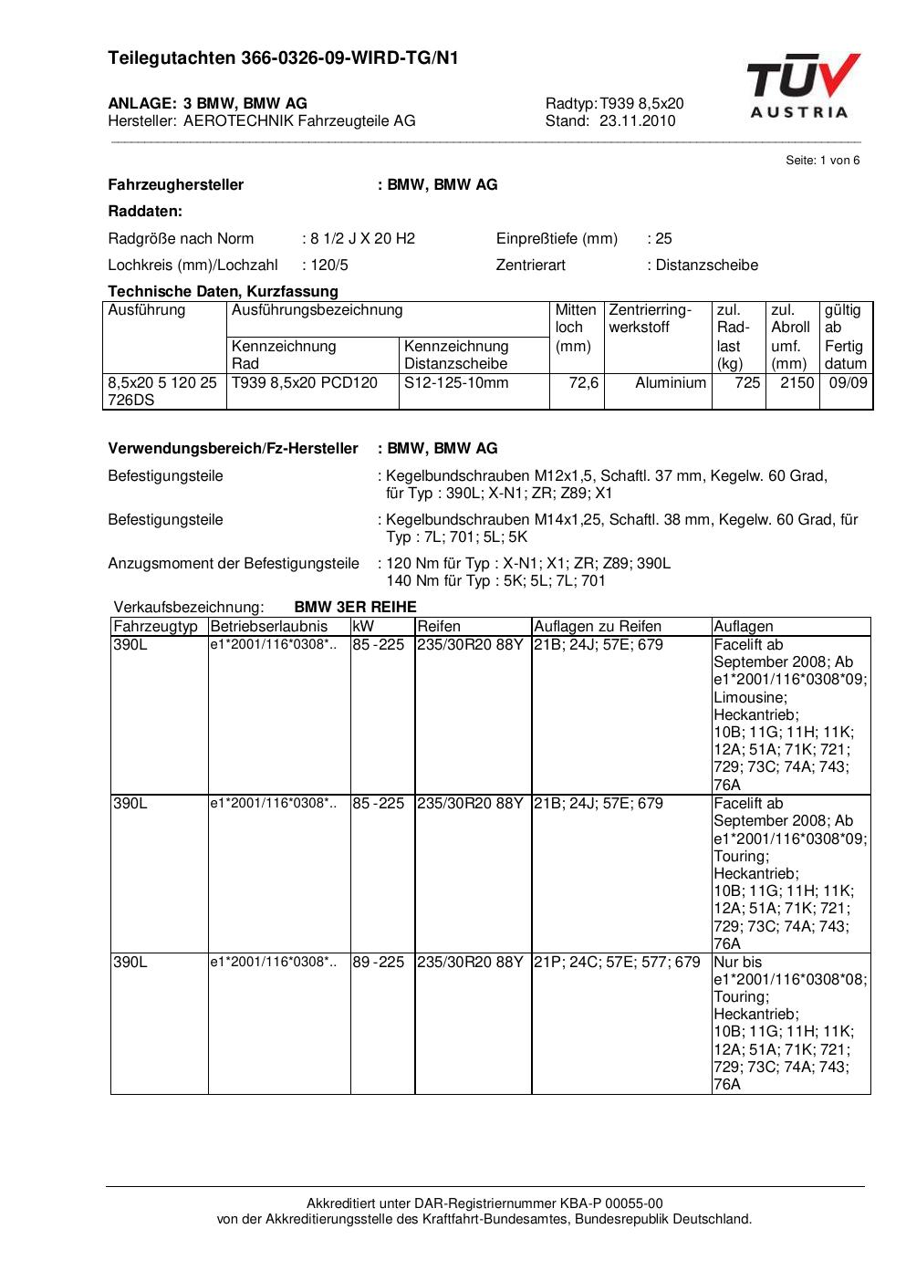 Dieses Gutachten (teilegutachten) bezieht sich auf die Alufelge ATS T939 8 in der Ausführung 8.5Jx2 ET 0, Mittenloch 0 mm . Im PDF findest du typischerweise zulässige Reifengrößen, Auflagen/Anbauhinweise und – je nach Dokument – Hinweise zur Eintragung.