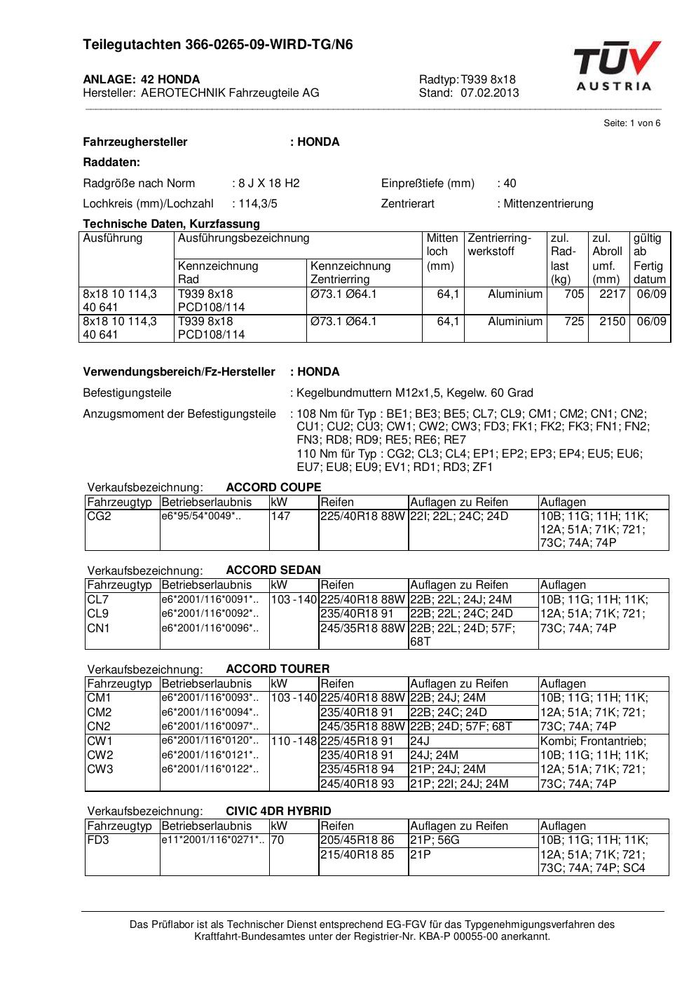 Dieses Gutachten (teilegutachten) bezieht sich auf die Alufelge ATS T939 8x18 in der Ausführung 8Jx18 ET 0, Mittenloch 0 mm . Im PDF findest du typischerweise zulässige Reifengrößen, Auflagen/Anbauhinweise und – je nach Dokument – Hinweise zur Eintragung.