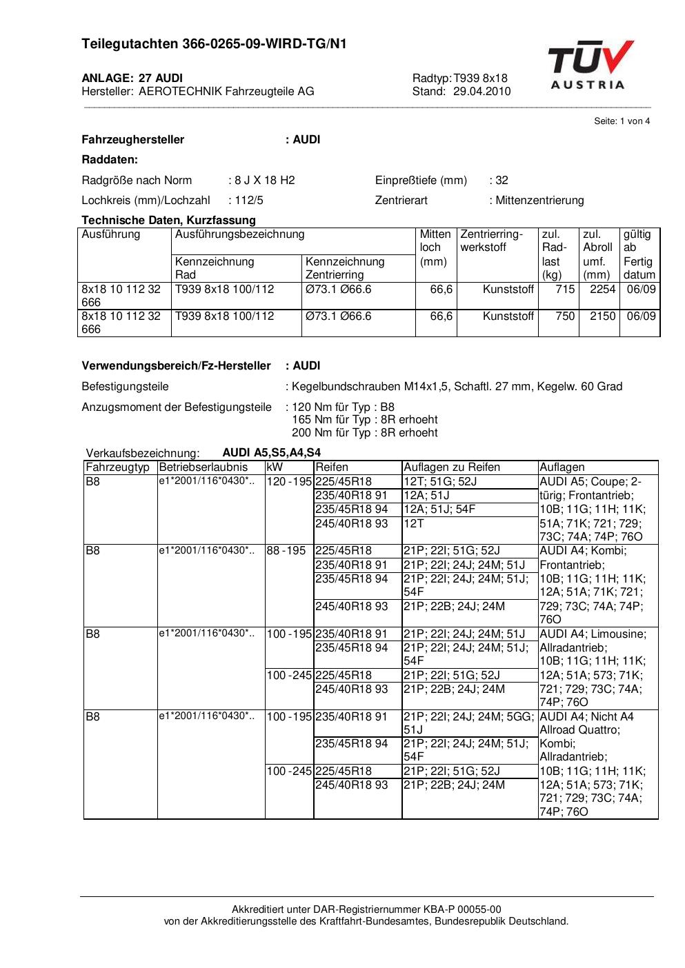 Dieses Gutachten (teilegutachten) bezieht sich auf die Alufelge ATS T939 8x18 in der Ausführung 8Jx18 ET 0, Mittenloch 0 mm . Im PDF findest du typischerweise zulässige Reifengrößen, Auflagen/Anbauhinweise und – je nach Dokument – Hinweise zur Eintragung.