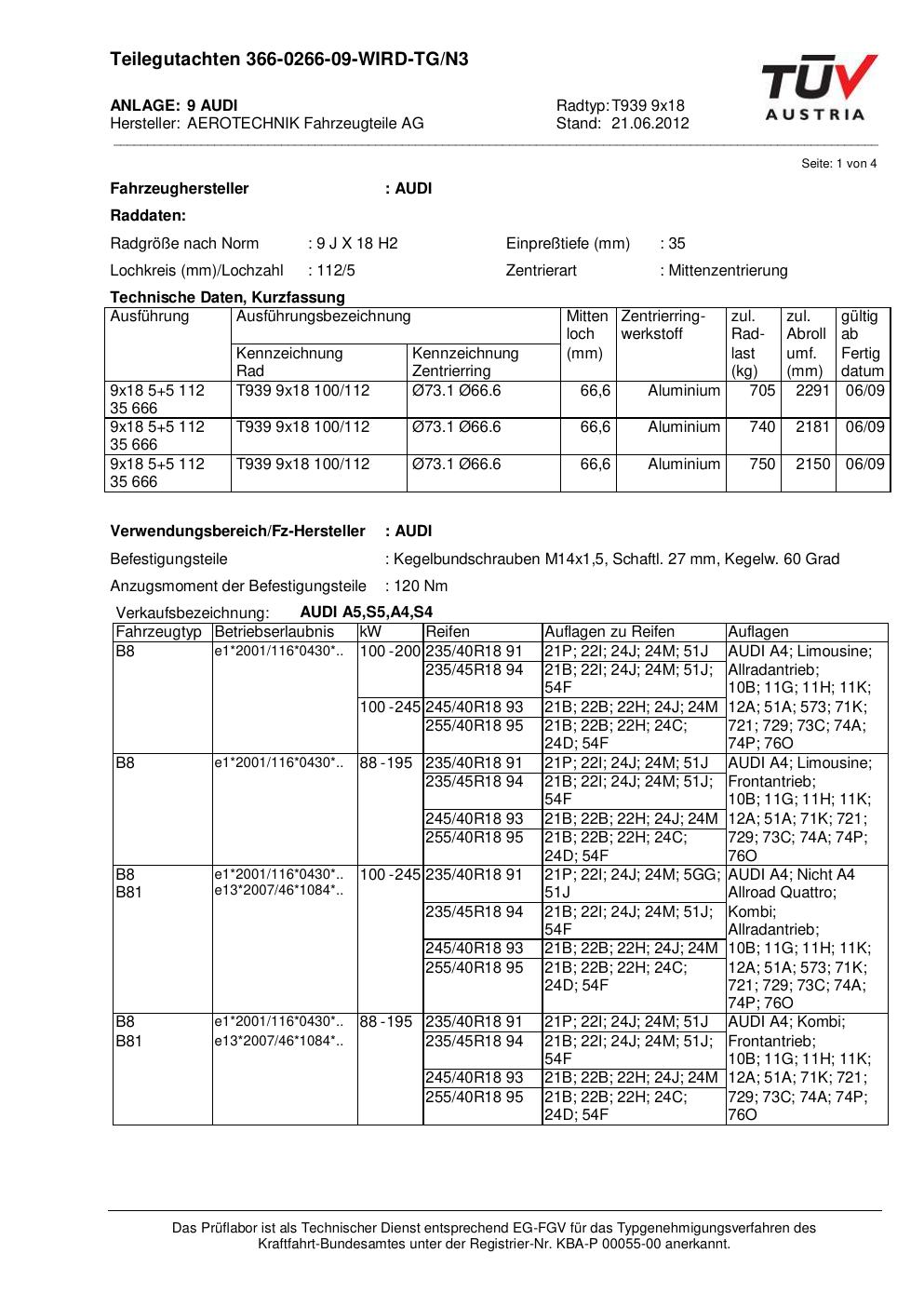 Dieses Gutachten (teilegutachten) bezieht sich auf die Alufelge ATS T939 9x18 in der Ausführung 9Jx18 ET 0, Mittenloch 0 mm . Im PDF findest du typischerweise zulässige Reifengrößen, Auflagen/Anbauhinweise und – je nach Dokument – Hinweise zur Eintragung.