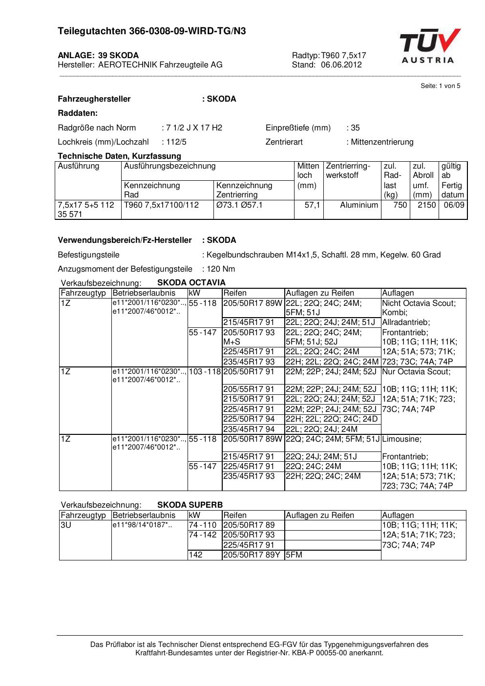 Dieses Gutachten (teilegutachten) bezieht sich auf die Alufelge ATS T960 7 in der Ausführung 7.5Jx17 ET 0, Mittenloch 0 mm . Im PDF findest du typischerweise zulässige Reifengrößen, Auflagen/Anbauhinweise und – je nach Dokument – Hinweise zur Eintragung.