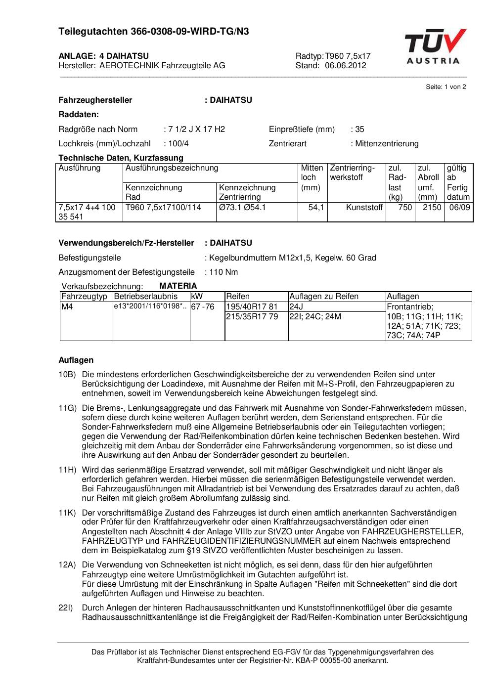 Dieses Gutachten (teilegutachten) bezieht sich auf die Alufelge ATS T960 7 in der Ausführung 7.5Jx17 ET 0, Mittenloch 0 mm . Im PDF findest du typischerweise zulässige Reifengrößen, Auflagen/Anbauhinweise und – je nach Dokument – Hinweise zur Eintragung.