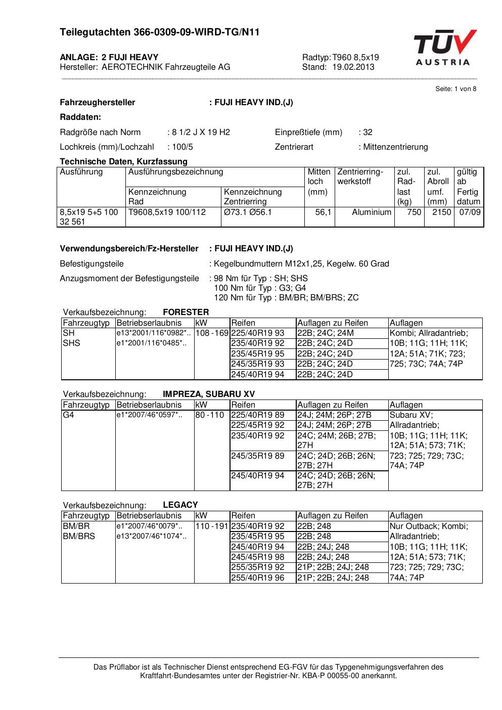 Dieses Gutachten (teilegutachten) bezieht sich auf die Alufelge ATS T960 8 in der Ausführung 8.5Jx19 ET 0, Mittenloch 0 mm . Im PDF findest du typischerweise zulässige Reifengrößen, Auflagen/Anbauhinweise und – je nach Dokument – Hinweise zur Eintragung.