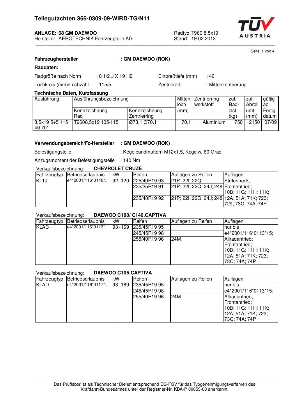 Dieses Gutachten (teilegutachten) bezieht sich auf die Alufelge ATS T960 8 in der Ausführung 8.5Jx19 ET 0, Mittenloch 0 mm . Im PDF findest du typischerweise zulässige Reifengrößen, Auflagen/Anbauhinweise und – je nach Dokument – Hinweise zur Eintragung.