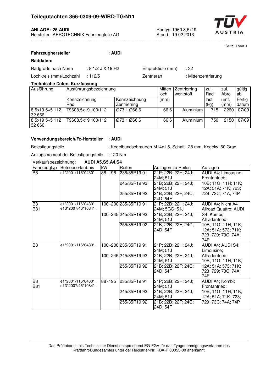 Felgengutachten / teilegutachten für Alufelgen ATS T960 8 (8.5Jx19 ET 0, Mittenloch 0 mm) (Zertifikatsnummer au). Hier kostenlos als PDF herunterladen. Der Download-Link ist 24 Stunden gültig und kann bis zu zwei Mal verwendet werden.