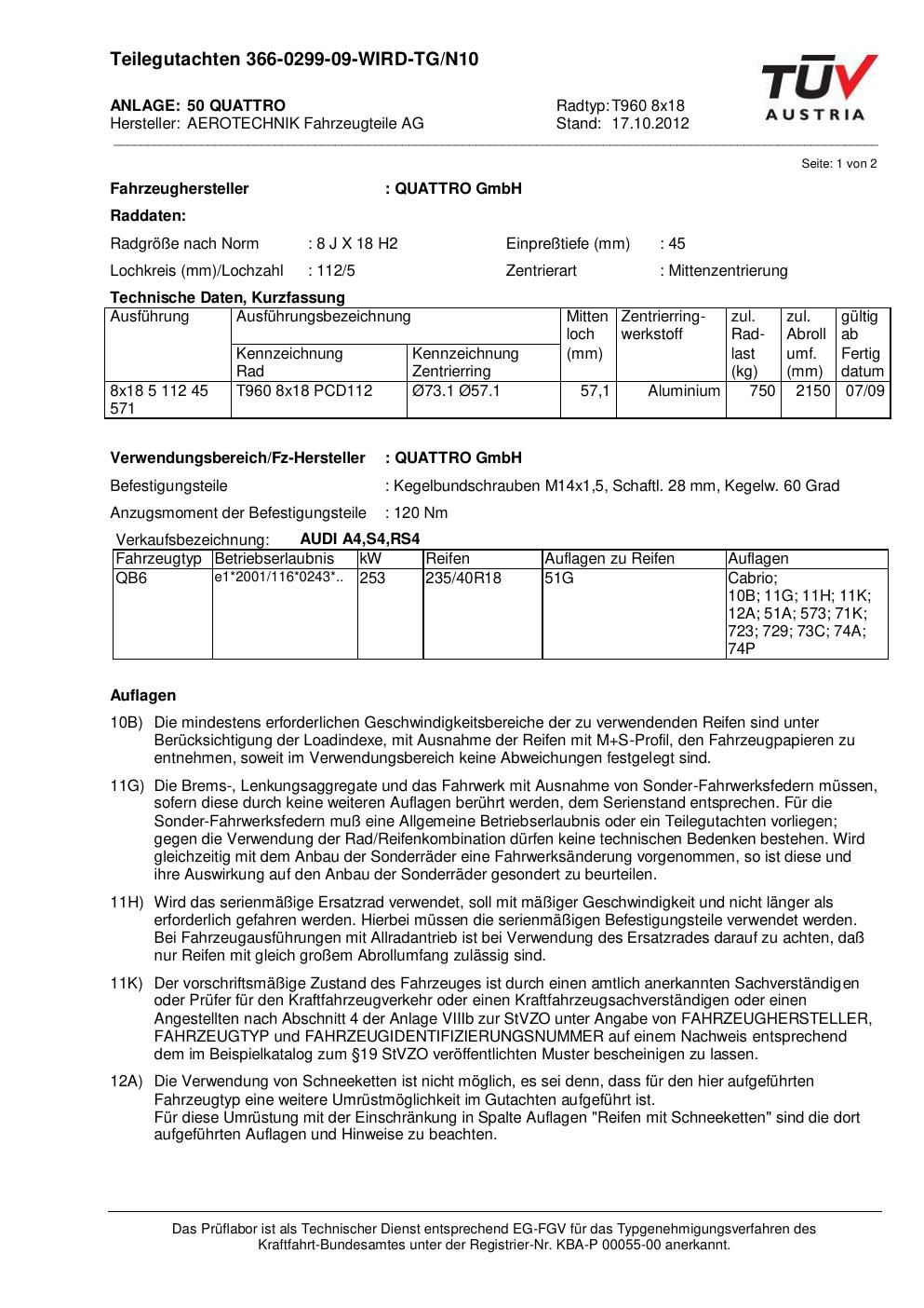 Dieses Gutachten (teilegutachten) bezieht sich auf die Alufelge ATS T960 8x18 in der Ausführung 8Jx18 ET 0, Mittenloch 0 mm . Im PDF findest du typischerweise zulässige Reifengrößen, Auflagen/Anbauhinweise und – je nach Dokument – Hinweise zur Eintragung.