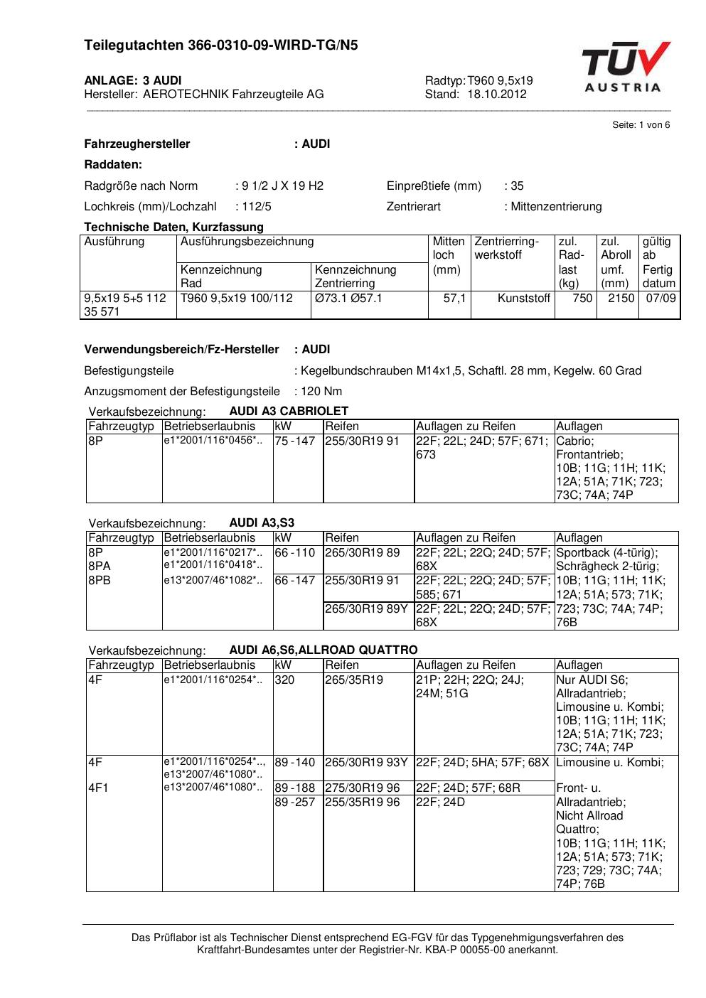 Felgengutachten / teilegutachten für Alufelgen ATS T960 9 (9.5Jx19 ET 0, Mittenloch 0 mm) (Zertifikatsnummer au). Hier kostenlos als PDF herunterladen. Der Download-Link ist 24 Stunden gültig und kann bis zu zwei Mal verwendet werden.