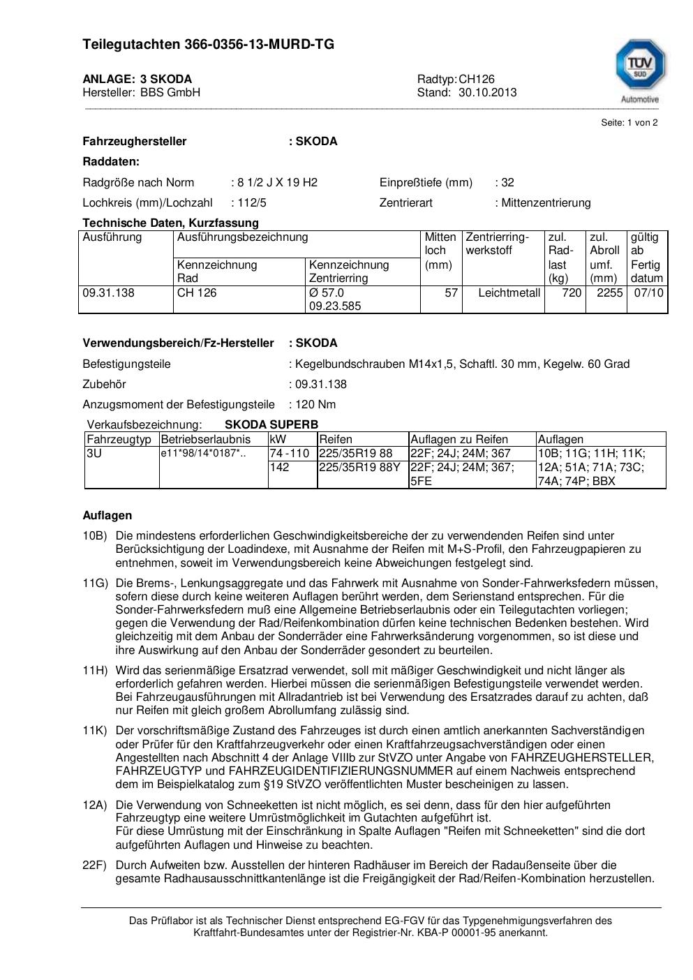 Dieses Gutachten (teilegutachten) bezieht sich auf die Alufelge BBS CH126 in der Ausführung 2Jx19 ET 0, Mittenloch 0 mm . Im PDF findest du typischerweise zulässige Reifengrößen, Auflagen/Anbauhinweise und – je nach Dokument – Hinweise zur Eintragung.