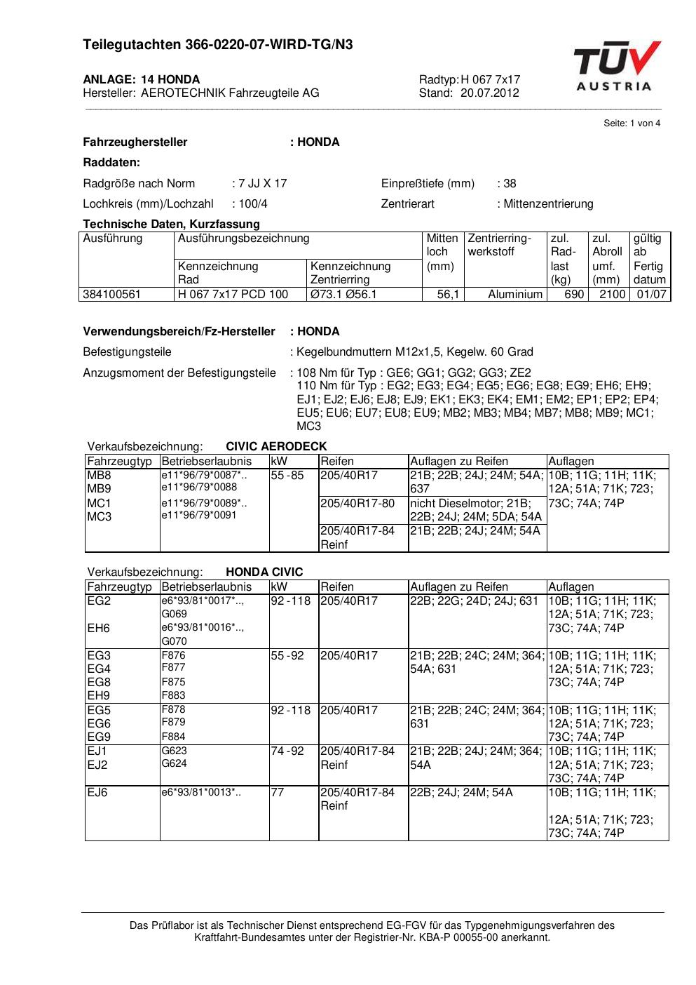 Dieses Gutachten (teilegutachten) bezieht sich auf die Alufelge co-rod H 067 7x17 in der Ausführung 7Jx17 ET 0, Mittenloch 0 mm . Im PDF findest du typischerweise zulässige Reifengrößen, Auflagen/Anbauhinweise und – je nach Dokument – Hinweise zur Eintragung.